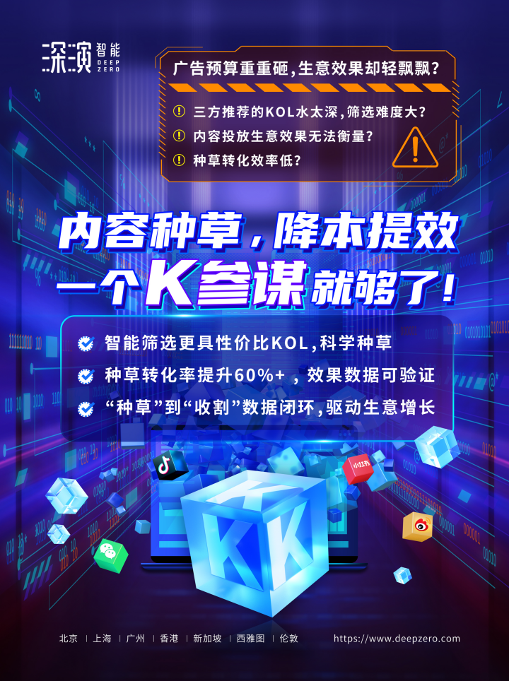 壹定发智能K参谋科学前选,可跨领域找到最能影响品牌目标TA人群的KOL进行投放,同时有效平衡投资回报率;内容营销数据可同电商后链路平台打通,进行数据归因分析,准确判断KOL影响的用户是否真实在电商平台产生购买行为;实现“种草”到“收割”链路闭环,轻松内容营销,可根据品牌方的业务需求提供一站式的KOL采买及数据验证服务,有利提升整体内容营销的效率与效果。
